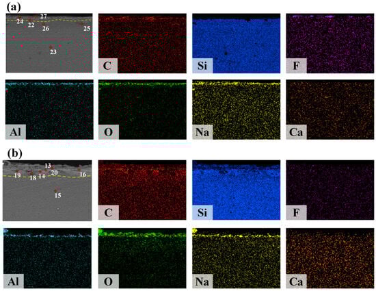 The chemical composition and elemental distribution of the slag-substrate interface were studied after the wetting experiments using SEM-EDS analysis. Figure 9 illustrates the elemental distribution at the interface between the slag droplets and the substrate for samples 2# and 5#. As shown in the figure, the microstructure can be categorized into two distinct layers: the slag interface layer and the original SiC substrate. The surface scanning results shown in the figure reveal the distribution of the major elements. From the first to the second layer, there is a gradual decrease in the contents of Al, O, and Na, while Si and C exhibit an opposite trend. Notably, the enriched regions of Al and O elements coincide, as do those of Al, Na, and O elements, as well as Si and C elements. Furthermore, the mass ratio of each component, as presented in Table 6, indicates that the primary phases within the substrate surface layer are Al2O3, Na3AlF6, and CaF2. By comparing the Si and C elements on the two substrate surfaces, it is observed that the Si element on the substrate surface of Slag 5# has obvious stratification and less content, and the C element is enriched more in the first layer. Physical and chemical dissolution occurs at the contact surface of Al2O3 and the electrolyte. The dissolved Al2O3 diffuses from the contact surface to the inside of the electrolyte, forming an adherent aluminum slag with the electrolyte. Aluminum and sodium phases will diffuse from the slag to the interfacial layer, while Al2O3 dissolves, and aluminum ions diffuse from the substrate to the interfacial layer. Both substrates comprise the Al-Na-F-O second phase in the SiC grains. The content of the second phase in Slag 5# is higher than that in Slag 2#. The interaction between the slag and substrate is limited due to the few reaction layers are detected at the interface between the slag and SiC refractory.