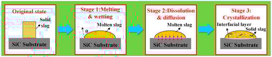In summary, the adhesion mechanism of the specified molten slag to the SiC substrate is illustrated in Figure 10. During heating, solid slag melts into a liquid state, and the contact angle decreases. Initially, the high surface tension of the slag due to the presence of a solid phase hinders wetting and prevents SiC dissolution. As the temperature rises, the surface tension of the slag drops, reducing the contact angle to a stable level. This improved wetting facilitated the penetration of the SiC substrate. Once the slag was fully liquefied, the dissolution of Al2O3 accelerated. However, the rapid heating rate resulted in a shorter dissolution time. Simultaneously, fluoride and aluminum ions from the slag diffused into the SiC substrate and reacted with it. The dissolution of Al2O3 is another critical factor contributing to the adhesion of SiC. The distribution of Na, O, and Al from the surface to the substrate layer was evident in the scan results shown in Figure 9. The dissolution of Al2O3 and the reactions involving Na3AlF6, SiO2, and Al2O3 suggested the precipitation of high-melting-point phases in the interfacial layer. The products gradually covered the substrate beneath the droplet, preventing the further slag dissolution. After the wetting experiments, no significant adhesion was observed on the SiC substrate. This was due to the good wettability and dissolution of Al2O3, which contributed to adhesion issues between the slag and the SiC refractory.