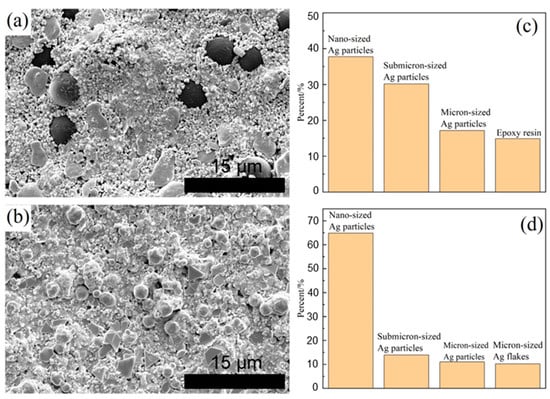 Microstructures and particle proportion of (a,c) semi-sintered Ag paste and (b,d) Ag paste.