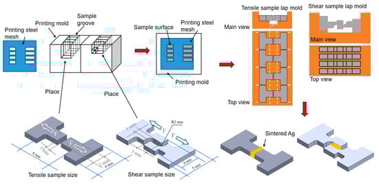- The process of printing silver paste is shown in Figure 2. The samples were placed and fixed in the corresponding grooves of the mold. The printing steel mesh was placed on the surface of the printing mold and aligned with the printing area of the fixture, and then the silver paste was printed on the sample surface. Four samples could be printed and prepared at once. The thicknesses of the steel mesh were controlled at 0.1 mm and 1 mm, respectively. The openings in the printing area need to match the contact surfaces of the shear and tensile mold, and the dimensions of the samples are as shown in Figure 2. Subsequently, the printed tensile samples and the non-printed samples were fixed in the left and right molds, respectively. There are positioning lines on both sides of the mold to prevent misalignment after fitting. There are grooves in the middle part of the mold to prevent the sintered silver paste from contacting the mold. The two molds are assembled together through the shape matching of their bases to complete the lapping. For the shear samples, the printed samples with the concave side up were placed in the left-side groove of the mold, and then the other samples with the concave side down were placed in the right side groove and pressed tightly to achieve lapping with the left-side samples.