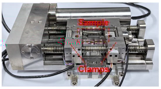 The shear and tensile tests were commissioned to Changsha Kaiple New Material Company in Changsha, China for completion. The shear and tensile test bench equipment are shown in Figure 3. Two tensile tests and two shear tests for each type of sintered Ag joints. Before the start of the tests, first, by adjusting the width of the clamps, the positions of the left and right clamps were made suitable for clamping samples of different sizes. Then, both ends of the sample were clamped between the left and right clamps. During the experiment, the drive shaft was driven by the motor to apply a load to the samples, and the absolute position code was read by the optical encoder on one side of the drive shaft. The load sensor collected the test data and recorded it in the computer. The shear and tensile tests were all carried out at room temperature, and loading speed was 2 μm/s. The equipment used to observe silver paste particles in this article was Thermo Fisher Scientific, Apreo 2, Waltham, MA, USA. The in situ shear and tensile tests were carried out in the scanning electron microscope (CIQTEK, SEM5000, Hefei, China), which was equipped with EDS (Oxford Instruments Ultim Max, Oxford, UK). The model of the shear and tensile test bench is PicoFemto—SEP, SEM5000 N, Anhui, China. The model of the optical microscope is Olympus, BX51, Hachioji, Japan. The thermogravimetric analyzer is METTLER TOLEDO, Thermal Analysis System 2, Greifensee, Switzerland.