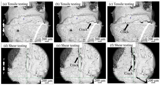 The in situ tensile and shear testing observations of sintered Ag joints: (a–c) tensile testing, and (d–f) shear testing.