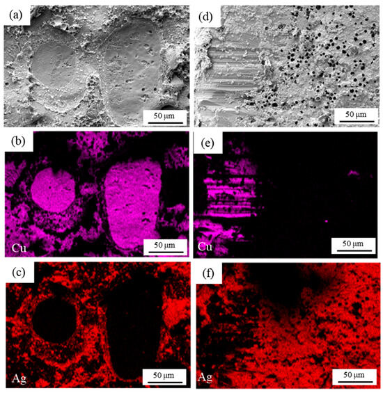 To understanding of the fracture behavior, it is necessary to observe tensile fractures and shear fractures. As shown in Figure 8 and Figure 9, SEM observation of the fracture surfaces of semi-sintered Ag joints and sintered Ag joints, and the distributions of Ag and Cu elements are given, respectively. In the tensile fracture surface of the semi-sintered Ag joint in Figure 8a–c, a large area of the Cu substrate is exposed, and Ag-Cu interface fracture has occurred. In the shear fracture surface of the semi-sintered Ag joint in Figure 8d–f, both the sintered Ag layer and the copper substrate exist, and holes left by unvolatilized resins can still be seen in the remaining sintered silver layer. Thus, it is a composite fracture mode, that is, both sintered Ag layer fracture and Ag-Cu interface fracture have occurred. The same Ag-Cu interface fracture morphology can be observed in the tensile fracture surface of the sintered Ag joints in Figure 9a–c, but the exposed Cu substrate area of the semi-sintered Ag joint is larger, indicating that the connection between the sintered Ag and the substrate is better than that of the semi-sintered Ag joints. The shear fracture morphology in the sintered Ag joint in Figure 9d–f is also a composite fracture mode. In summary, the fracture modes of both sintered Ag joints in tensile tests are Ag-Cu interface fractures, and the fracture modes in shear tests are composite fractures. The influence of their microstructures on the fracture mechanisms of the two sintered Ag joints needs to be further discussed and analyzed.