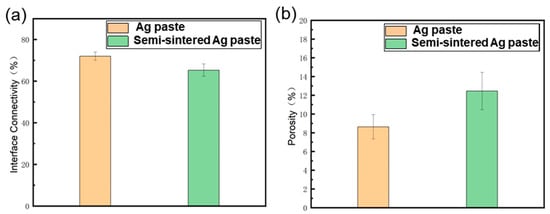 - Due to the resins and organic substances blocking the diffusion of Ag atoms, the semi-sintered Ag joint is mainly surface diffusion-dominated during the sintering densification process, while the sintered Ag joint is the result of the combined action of surface diffusion and grain-boundary diffusion, resulting in a higher porosity and a lower interface connection rate in the semi-sintered Ag joint.