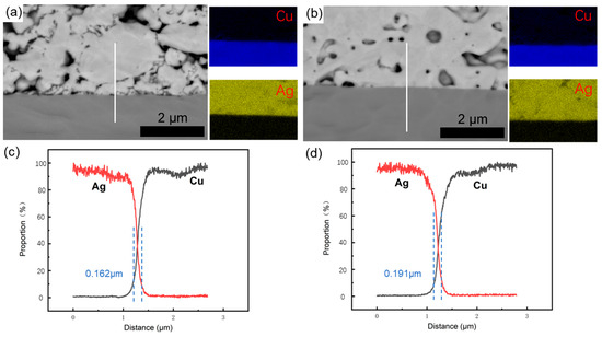 The EDS elemental profiles of (a) semi-sintered Ag joints and (b) sintered Ag joints. (c,d) show those at the lines indicated as white lines in (a,b).