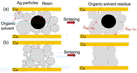 The sintering densification processes of the two Ag pastes are shown in Figure 13. Before sintering, Ag particles are piled up with each other and wrapped in organic solvents. At the initial stage of sintering when the temperature is low, the volatilization and decomposition of organic solvents mainly occur, and the surface diffusion mechanism is dominant at this time. When the sintering temperature is increased and the organic solvents are further volatilized and reduced, the contact area between particles becomes larger, and the grain-boundary diffusion becomes the dominant mechanism. Meanwhile, nano-silver particles have both high surface energy and more grain boundaries. At this stage, the sintering necks are coarsened and grown, and the pores in the structure are closed to form a dense sintered body, that is, the sintered Ag body structure. Asoro et al. [23] proposed that some sintering necks will preferentially grow in places where the organic shells are thinner. Although the existence of organic solvents will not completely prevent the diffusion of particles, the sintering process will be significantly slowed down. Therefore, more organic substances left in the semi-sintered Ag paste will hinder the process of sintering densification. Moreover, the existence of resins will also hinder the contact between particles and the diffusion of Ag atoms. In addition, the proportion of nano-silver particles in the semi-sintered Ag paste is small, with the result that semi-sintered Ag paste still mainly has surface diffusion in the later stage of sintering, the degree of sintering densification is low, and some particles still maintain their original particle shapes after sintering. Therefore, the semi-sintered Ag paste sintering is mainly based on surface diffusion, while the Ag paste sintering is the result of the combined action of surface diffusion and grain-boundary diffusion. In the experiment on the influence of different metal-plating layers on the interface fracture toughness of sintered Ag by Wang et al. [24], it was proposed that the difference in the inter-diffusion behavior between Au, Cu, and the sintered Ag layer is the fundamental factor affecting the interface fracture behavior. In the experiment in this paper, the larger surface diffusion rate of the Ag paste can promote sufficient diffusion of Ag atoms on the surface of the Cu substrate, and increase the contact area between Ag atoms and Cu atoms, while at the same time, the diffusion activation energy of the grain boundaries is lower, which can promote the rapid inter-diffusion of Ag and Cu atoms through the grain boundaries, and form a tight connection between the sintered Ag layer and the Cu substrate, so the interface connection rate of the sintered Ag joint is higher.