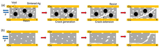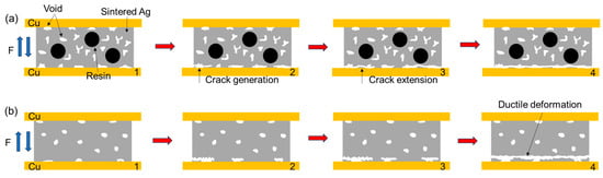 In summary, Figure 14 and Figure 15 show, respectively, the schematic diagrams of the tensile and shear fracture modes of the two sintered Ag joints. During the tensile process, the fracture occurs at the Ag-Cu interface. The semi-sintered Ag joint has a low interface connection rate and more pores. Stress concentration is likely to occur preferentially at the pores, leading to the generation of cracks (Figure 14(a2)), and then under the action of tensile stress, it quickly spreads to the entire Ag-Cu interface, resulting in failure (Figure 14(a4)). In the sintered Ag joint, the Ag-Cu interface has better connection quality, as the possibility of crack generation is smaller, certain ductile deformation is exhibited during the tensile process, and the fracture location is closer to the sintered silver layer at the interface (Figure 14(b4)). During the shear process, the pores at the Ag-Cu interface of the semi-sintered Ag joint, as weak parts, preferentially generate cracks, and the acute-angled holes in the sintered body generate stress concentration at the tips (Figure 15(a2)). Under the action of shear force, the cracks quickly expand along the holes. When encountering the resin, the resin can resist the expansion of the cracks, but the resin and the sintered Ag body also belong to a heterogeneous interface. Under the action of stress, the cracks then expand from the Ag body beside the resin (Figure 15(a3)). Finally, damage and failure are caused at both the Ag-Cu interface and the sintered Ag layer, showing a composite fracture mode (Figure 15(a4)). In the sintered Ag joint, on the one hand, the Ag-Cu interface has better connection quality; on the other hand, it has fewer holes and the shapes are more rounded, which is not conducive to the generation and expansion of cracks, and more energy is required when finally causing shear failure (Figure 15b), so the shear strength of the sintered Ag joint is higher.