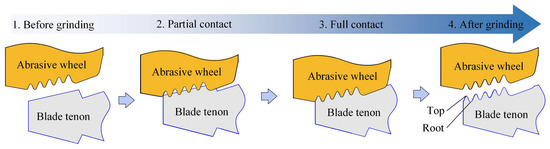 The blank blade tenon was casted in a trapezoidal shape, as shown in Figure 2. The grinding process can be categorized into partial contact and full contact stages with the decrease in machining allowance. When the abrasive wheel firstly contacts the blank blade tenon, the material removal occurs only in the root area of the tenon tooth, entering the partial contact stage. At this stage, the actual removed material is minimal due to the narrow grinding width, but the material removal rate is high due to the large grinding depth in process 1. When the cumulative grinding depth increases, the top of the tenon teeth contacts the abrasive wheel, causing the entire grinding wheel profile to engage with the workpiece surface, entering the full contact stage, and the grinding width reaches the maximum value.