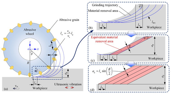 where larc denotes the length of the grinding arc, [32], ap denotes the grinding depth, R denotes the radius of the abrasive wheel and au denotes the undeformed chip thickness in UVG. According to Equation (2), the value of rc is related to au. In this study, the undeformed chip thickness in CG is described, at first, on the basis of an equivalent grinding zone model. Then, the value of au is obtained by considering the influence of the ultrasonic vibration based on the probability superposition method.