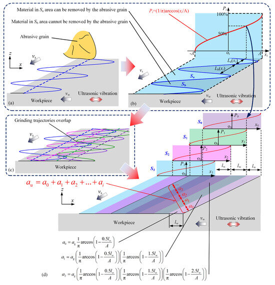 In the study, the distribution of abrasive grains on the wheel surface follows the uniform probability distribution [33,34] with the unchanged probability density of . The probability superposition method is utilized for the undeformed chip thickness. It considers the material removal process in UVG as vibration area superposition. For instance, for a single abrasive grain, the periodic wave curve covers a vibration area in the grinding zone, as shown in Figure 4b. The material in the vibration area may or may not be removed. In detail, the material in the sub-area can be removed by the current abrasive grain; however, the material in the sub-area cannot be removed due to the periodic wave curve of the grinding trajectory in UVG, as shown in Figure 4b. A function can be used to describe the relationship between the material coordinate and the material removal probability, as follows: