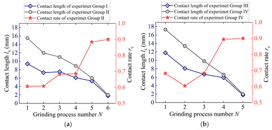 Figure 5 shows the contact length and contact rate of the experiments of Groups I–IV. Generally, the contact length both in CG and in UVG is reduced with the increase in the grinding process number. The contact rate shows the opposite tendency. In Group I, the contact length in CG reaches the maximum value of 15.5 mm in the first grinding process due to the large grinding depth. The ultrasonic vibration causes a reduction in the contact length to 9.4 mm. The contact rate of UVG is 0.61. The short contact length indicates a remarkable intermittent cutting behavior. With the reduction of the material removal rate, the contact length in CG decreases to 0.2 mm in the last grinding process, and the contact rate increases to 0.9. This suggests that the degree of intermittent cutting behavior becomes limited when the grinding depth is small. The ultrasonic vibration performs better in grinding with large material removal rates.