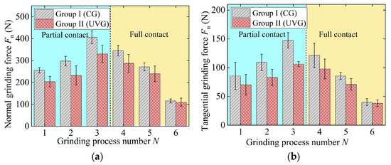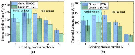 The grinding parameters are characterized by large material removal rates in Groups III and IV, wherein processes 1 and 2 are at the partial contact stage and processes 3–5 are at the full contact stage, as shown in Figure 7. As a result, the grinding force in the first two processes increases, while the force in the last three processes gradually decreases, as shown in Figure 7. The maximum normal and tangential forces in CG are 396.32 N and 136.87 N, respectively. The maximum forces in UVG are 20.70% (normal force) and 24.73% (tangential force) lower than those in CG.