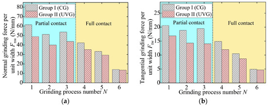 To eliminate the influence of the grinding width on the grinding force, the performance of UVG is evaluated by the grinding force per unit width, as shown in Figure 8 and Figure 9. At the partial contact stage, the normal and tangential forces per unit width in CG remain approximately 53 N/mm and 20 N/mm, respectively. After entering the full contact stage, the grinding force per unit width gradually decreases to 33.25 N/mm and 10.49 N/mm. In the fine grinding stage, due to the low material removal rate, the normal and tangential forces in CG are reduced to 14.16 N/mm and 4.91 N/mm, respectively.