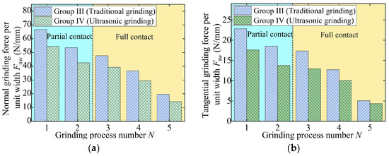 Grinding force per unit width in experiment Group III and Group IV: (a) normal grinding force and (b) tangential grinding force.