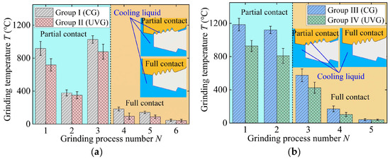 In Groups I and II, the grinding temperatures in process 1 and process 3 are higher than those in the other four processes, as shown in Figure 10a. This is because the material removal rate in process 1 is the largest. The material generates significant heat during the plastic deformation process, raising the grinding temperature to 918 °C. In the third grinding process, the full contact stage starts, and the continuous and complete contact surface hinders the grinding fluid from entering the grinding area, significantly reducing the heat exchange efficiency. Furthermore, the entire tenon tooth surface becomes a heat-generating area during material removal, limiting the space available for heat conduction when the grinding wheel is fully in contact, resulting in the highest grinding temperature of 1026 °C.