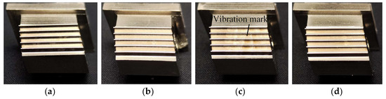 A high grinding temperature further affects the blade tenon surface, as shown in Figure 11. The blade tenon surface of experiment Groups I, II and IV is smooth. No obvious machining defects can be directly observed. However, visible vibration marks are found on the surface of experiment Group III. This is because the temperature-affected layer of the material is too deep in Group III, and subsequent processes cannot fully remove it, which significantly reduces surface quality.