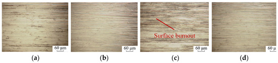 Figure 12 shows the surface topography of the K4002 nickel-based superalloy blade tenon. Obvious grinding marks are visible in Groups I, II and IV. However, no intermittent grinding marks are observed on the surface in Groups II and IV, primarily because the grinding depth in the fine grinding process is very small. The small grinding depth of the last grinding process covers the intermittent cutting marks. Moreover, grinding burnout defects are observed on the surface of Group III, as displayed in Figure 12c.