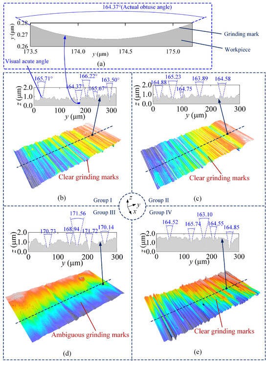 To evaluate the workpiece surface quality, 30 grinding marks with clear edges were extracted from the ground surface of each group, and the vertex angles of the grinding marks were measured. The average vertex angles of the grinding marks in Groups I, II and IV are 164.97°, 164.09° and 165.45°, respectively. The standard deviations of measurement are less than 2.5°. However, the average vertex angle in Group III expanded to 170.49°, which is larger than the values of the other groups. Note that all the measured vertex angles are greater than 90° in Figure 13. But the vertex angles are shown as acute angles in Figure 13b–e because the scale of the y-axis is much larger than the scale of the z-axis. The vertex angle is changed to the correct visual obtuse angle when the scales of the z-axis and y-axis are under the same order of magnitude, as shown in Figure 13a.