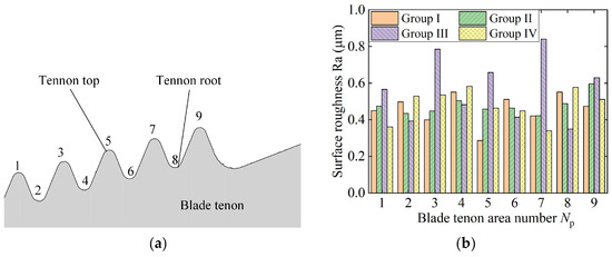 In the experiments, the surface roughness was measured at nine different positions based on the tenon profile shape. The measured position number is illustrated in Figure 14a, wherein the odd-numbered positions refer to the top of the tenon profile, and the even-numbered positions refer to the root. The results show that the surface roughness in Groups I, II and IV is maintained within Ra 0.4–0.6 µm. The roughness values in the three groups are of same order because the values of the grinding depth in the final machining process are very small ().