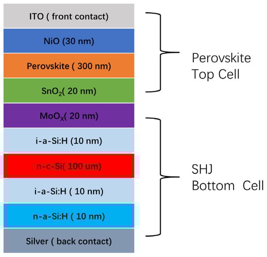 This tandem solar cell consists of an SHJ bottom cell and a perovskite top cell. As shown in Figure 1, the tandem device structure is as follows: ITO/NiO/perovskite/SnO2/MoOX/i-a-Si:H/n-c-Si/i-a-Si:H/n-a-Si:H/Ag. The material of FA0.83Cs0.17PbBr0.85I2.15, with a bandgap of 1.7 eV [41], is selected as the absorber layer in the top cell. The initial HTL of the top cell is NiO, and the ETL is SnO2. MoOX serves dual functions, not only acting as the emitter for the bottom cell but also participating in current recombination with SnO2.