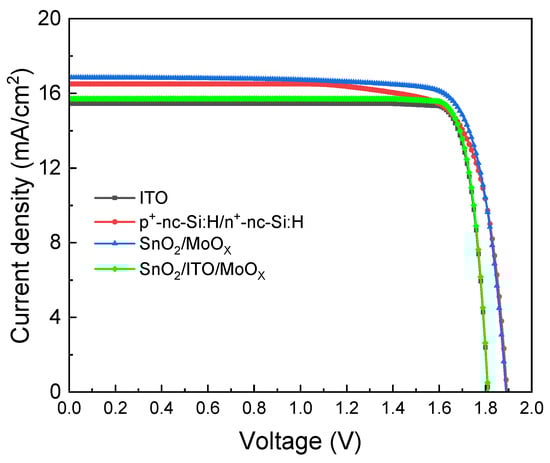 As shown in Figure 3, the J-V curves demonstrate that the interlayer-free device has the best efficiency. Compared to the ITO and tunnel junction structures, this interlayer-free device reduces parasitic absorption, allowing for more effective light absorption. Regarding VOC, as shown in Table 4, the devices with an ITO intermediate layer exhibit a decrease in VOC due to the resistive shunting effect of the ITO layer. Additionally, the devices with the SnO2/MoOX recombination layer show a slight reduction in VOC compared to nc-Si:H tunnel junctions. This may be related to insufficient optimization of the recombination layer [23], which leads to the accumulation of un-recombined charges at the SnO2/MoOX interface, thereby affecting the overall performance of the device.
