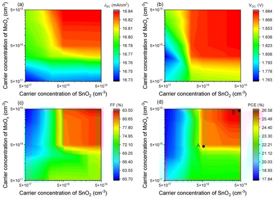 Effect of carrier concentration in the SnO2/MoOX recombination layer on device performance of tandem cells: (a) JSC, (b) VOC, (c) FF, and (d) PCE.
