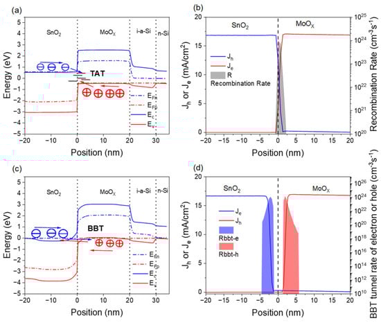 To analyze the mechanism underlying the efficiency improvement with increasing carrier concentration in the recombination layer, points A and B in Figure 4d are selected, corresponding to the carrier concentrations of 5 × 1018 cm−3 and 5 × 1019 cm−3, respectively. Figure 5 shows the energy band diagrams and electron (hole) current density distributions for points A and B. The band alignment in the recombination layer determines whether charge transport occurs via band-to-band tunneling (BBT) or a trap-assisted tunneling (TAT) mechanism [54]. In the recombination layer, the carriers in the SnO2 layer are primarily electrons, while the carriers in the MoOX layer are holes. The energy band diagram in Figure 5a shows a clear separation between the quasi-Fermi level of electrons in SnO2 and that of holes in MoOX. There is no overlap between the valence band (EV) of MoOX and the conduction band (EC) of SnO2. From Figure 5b, we observe the electron–hole current density distribution and a high recombination rate at the SnO2/MoOX interface. These results suggest that the charge transport in the recombination layer occurs via TAT due to interface defects.