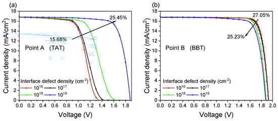 This section investigates the impact of the defect density at the SnO2/MoOX interface on tandem device performance. Points A and B from the previous section are chosen for the analysis. For point A, as illustrated in Figure 6a, when the defect density at the recombination layer interface increases from 1 × 1016 cm−2 to 1 × 1019 cm−2, the cell efficiency is raised from 15.68% to 25.45%. Since the recombination mechanism at point A is dominated by TAT, a high interface defect density significantly enhances electron–hole recombination in the recombination layer, thereby improving the tandem device efficiency. However, for point B, dominated by BBT, increasing the interface defects results in a reduction in tandem cell efficiency. As illustrated in Figure 6b, the efficiency decreases from 27.05% to 25.23% when the defect density is changed from 1 × 1016 cm−2 to 1 × 1019 cm−2. Therefore, the optimal doping concentrations for SnO2 and MoOX are 5 × 1019 cm−3, and the ideal defect density at the SnO2/MoOX interface is 1 × 1016 cm−2.