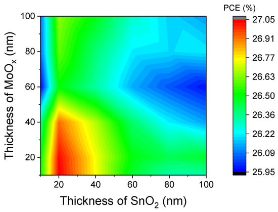 This section examines the impact of SnO2/MoOX recombination layer thickness on tandem cell performance. Figure 7 illustrates the variation in device efficiency as the thicknesses of the SnO2 and MoOX layers are adjusted from 10 nm to 100 nm. When the thicknesses of the SnO2/MoOX layer are more than 20 nm/20 nm, the PCE declines. Notably, the MoOX layer is dual-functional, and the variations in its thickness can affect both its role as the emitter in the bottom cell and its involvement in electron–hole recombination. The recombination layer exhibits intrinsic optical absorption. Generally, an excessively thick recombination layer reduces cell efficiency due to optical absorption, while an overly thin film not only affects uniform converge but also impairs charge recombination. As shown in Figure 7, the optimal thicknesses for both the SnO2 and MoOX layers are approximately 20 nm, consistent with their initial thicknesses. Therefore, the thicknesses of the SnO2 and MoOX layers are set to 20 nm each, and the optimized device can achieve a PCE of 27.05%, in agreement with previous results in Section 3.2.2.
