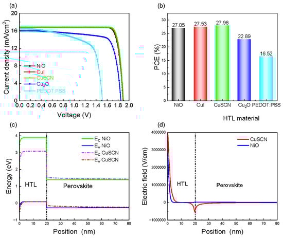 This section investigates the effect of different HTLs on the top cell on the device performance. The HTLs include NiO, CuI, Cu2O, CuSCN, and Poly(3,4-ethylenedioxythiophene)/Poly(styrenesulfonate) (PEDOT:PSS). The relevant parameters for each HTL are shown in Table 3. Figure 8a presents the J-V curves for these HTLs, while Figure 8b shows the corresponding tandem solar cell efficiency, and CuSCN exhibits the best efficiency of 27.98%. To analyze the reasons for the improved cell performance when CuSCN replaces NiO, Figure 8c compares the energy band diagrams of CuSCN and NiO as HTLs. The valence band offset (VBO) represents the difference between the valence band of the HTL and that of the perovskite layer, which is calculated as VBO = EV(HTL) − EV(perovskite). A negative VBO corresponds to a cliff-like band alignment. As shown in Figure 8c, the NiO/perovskite interface has a cliff of −0.55 eV. The cliff-like band structure does not prevent carrier extraction from the perovskite layer. However, a large cliff significantly increases the recombination rate at the interface [55]. In contrast, CuSCN is used as the HTL, which results in a smaller VBO (−0.45 eV) with the perovskite layer. Thus interface recombination can be reduced, and the efficiency can then be improved from 27.05% to 27.98%. Figure 8d shows the electric field at the HTL/perovskite interface when using CuSCN and NiO as HTLs. With CuSCN as the HTL, the electric field at the interface is broader and stronger, facilitating hole transport. Therefore, CuSCN is chosen as the optimal HTL for the perovskite top cell.