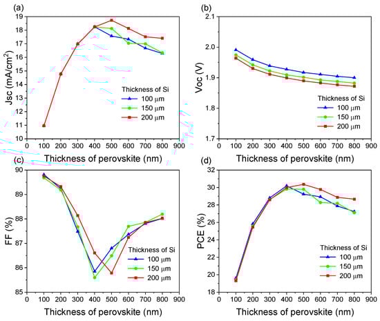 Regarding VOC, as shown in Figure 9b, increasing the absorption layer thickness slightly decreases VOC. As the absorption layer thickness increases, carrier recombination can be enhanced, resulting in VOC reduction. As shown in Figure 9c, FF varies differently from JSC. As the perovskite layer thickness increases, FF first decreases, reaching a minimum value at the current-matching point, and then it increases again, suggesting that FF variation is closely related to the degree of current matching between sub-cells [56]. As shown in Figure 9d, the trend in PCE is similar to that of JSC. As the perovskite layer thickness increases, PCE first increases and then decreases, primarily due to the increase in JSC. When the absorption layer is 500 nm in the top cell and the absorption layer is 200 μm in bottom cell, the tandem device achieves the highest PCE of 30.56% under the condition of current matching.