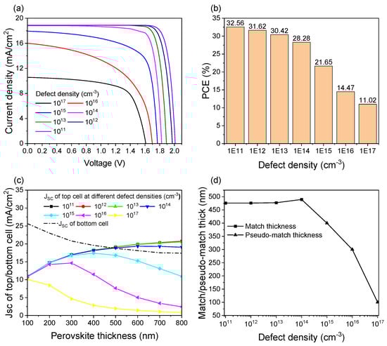 Tandem cell performance under different defect densities (a) J-V curves, (b) PCE, (c) JSC of sub-cells with different perovskite thicknesses, and (d) optimal perovskite thickness.