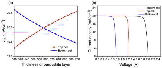 (a) JSC of sub-cells as a function of perovskite thickness. (b) J-V curves of the tandem and its sub-cells under the condition of current matching.