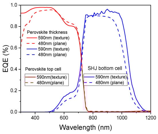 Finally, we consider the actual tandem solar cell device structure, in which the perovskite top cell is deposited on the textured SHJ bottom cell. Consequently, the previous planar model is converted into a textured one. The front surface of the SHJ bottom cell features a pyramidal texture, characterized by a pyramid angle of 54.74°, width of 3.536 μm, and height of 5 μm. The crystalline silicon layer in the bottom cell retains a thickness of 200 μm. As shown in Figure 11a, the current-matching point is achieved at a 590 nm perovskite absorber thickness, corresponding to a JSC of 20.23 mA/cm2. Figure 11b illustrates the J-V curves of the tandem cell and its sub-cells at the matching point, where the JSC of the sub-cells and the tandem cell are nearly identical. As summarized in Table 5, the tandem cell exhibits a VOC of 2.01 V and a PCE of 35.31%, closely matching the sum of the performance of the two sub-cells. To explore the reason for efficiency improvement by texture structure, Figure 12 compares the external quantum efficiency (EQE) of the textured and planar structures at the current-matching point. The textured structure enhances the absorption in the bottom cell above 900 nm and the top cell below 400 nm, leading to performance improvement.