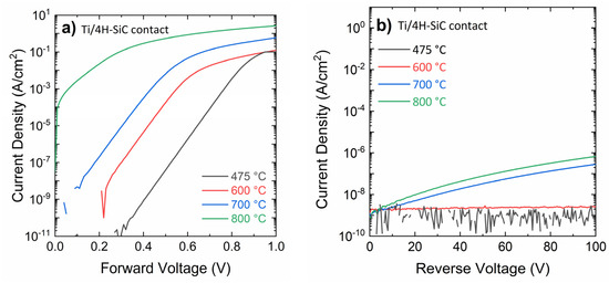 As can be observed in Figure 2a, up to the annealing temperature of 700 °C, the forward J-V characteristics of the Ti/4H-SiC diodes showed a wide linear region in a semilog scale, extending over 6–7 orders of magnitudes. However, a gradual shift of the forward characteristics towards lower turn-on voltages was observed with increasing annealing temperature. After annealing at 800 °C, the diode turn-on and the linear region were notably reduced.