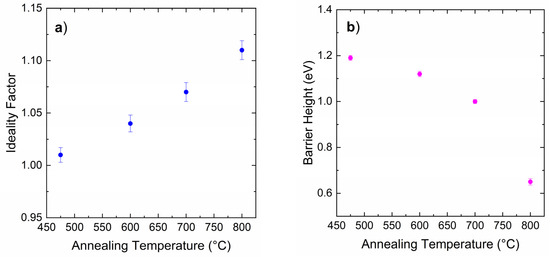 Ideality factor (a) and Schottky barrier height (b) values derived by applying the TE model to the forward characteristics of the Ti/4H-SiC Schottky diodes subjected to thermal annealing treatment at temperatures of 475 °C, 600 °C, 700 °C, and 800 °C.