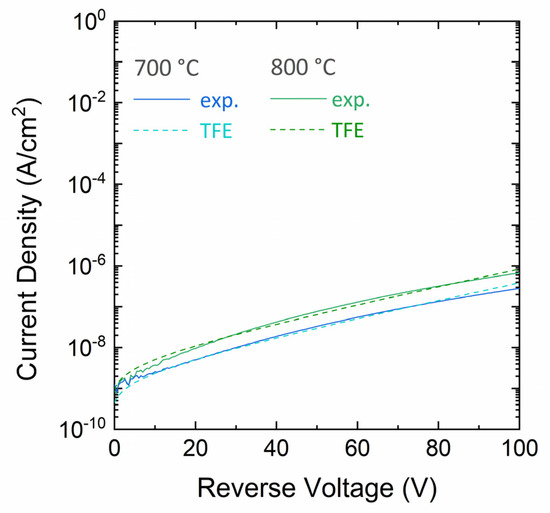 For the 700 °C and 800 °C annealed Ti/4H-SiC contacts, for which the current level was well above the sensitivity limit, the experimental and fitted reverse curves according to the TFE theory are reported in Figure 4.