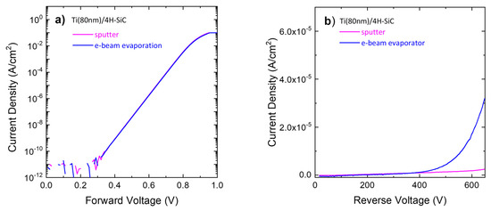 The forward characteristics (Figure 5a) demonstrated an independence of the deposition method for the two contacts. Instead, under reverse bias (Figure 5b), the two contacts featured similar characteristics up to about 400 V, while above a sudden current increase was observed for the evaporated Ti/4H-SiC contact.