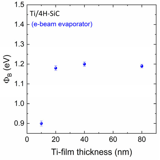 Barrier height values extrapolated from the electrical characteristics of e-beam evaporated Ti-layer on 4H-SiC with a thickness of 10, 20, 40, and 80 nm.