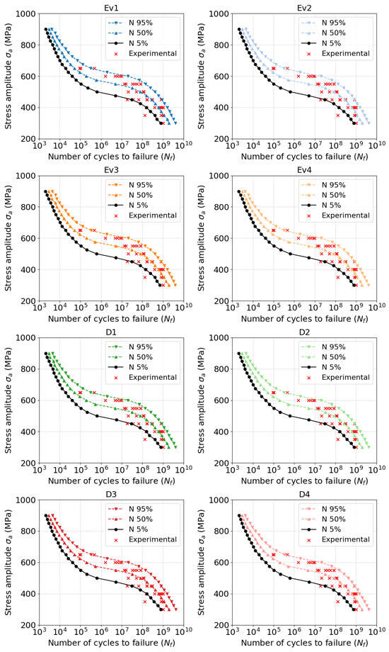 Predicted Woheler curves compared with experiments: Batches Ev1...D4.