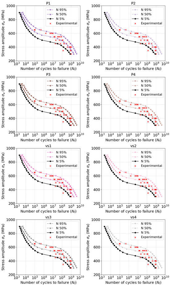 Figure 5 and Figure 6 show the model predictions for all investigated batches and their dependent parameters. In general, the model was able to infer the fatigue strength throughout the whole range, especially well in the VHCF range. Figure 7 and Figure 8 provide evidence of the sensitivity of the model to variations in the microstructure. The mean value of fatigue strength across all stress amplitude varies with every batch and its microstructural features. However, in Figure 8, it is evident that the fatigue strength follows a strength with energy density. Increased energy density in the second exposure led to improved fatigue life at 400 MPa of stress amplitude.