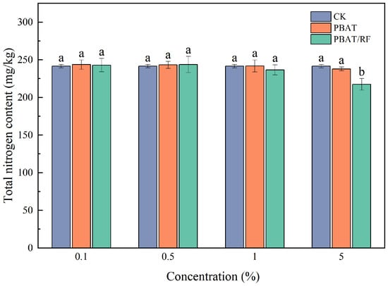 3.3.3. Effects of the PBAT and PBAT/RF Mulch Films on the Soil’s Total Nitrogen Contents