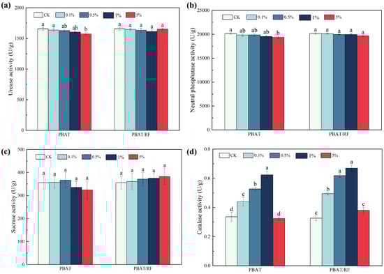 3.3.4. Effects of the PBAT and PBAT/RF Mulch Films on the Soil’s Enzyme Activities