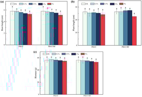 3.4.2. Effects of the PBAT and PBAT/RF Mulch Films on Soybean Root Length, Plant Height, and Biomass