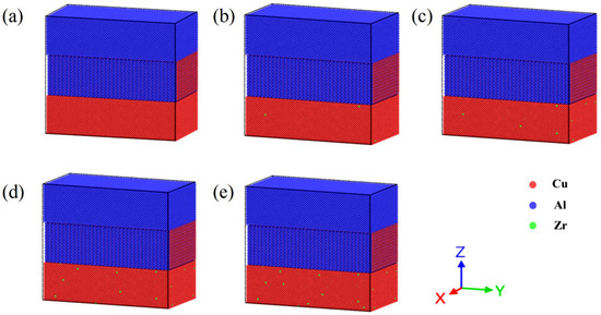 Cu-Zr/Al2Cu/Al model doped with different contents of Zr. (a) Cu-Zr/Al2Cu/Al; (b) Cu-0.2Zr/Al2Cu/Al; (c) Cu-0.4Zr/Al2Cu/Al; (d) Cu-0.6Zr/Al2Cu/Al; (e) Cu-0.8Zr/Al2Cu/Al.