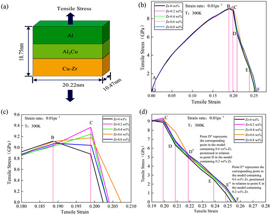 Tensile model and stress–strain curve of Cu-Zr/Al2Cu/Al vertical interface with different Zr content: (a) Cu-Zr/Al2Cu/Al vertical interface tensile model; (b) tensile stress–strain curve of Cu-Zr/Al2Cu/Al vertical interface; (c) local enlarged view of the plastic deformation stage; (d) local enlarged view of the tensile fracture stage.