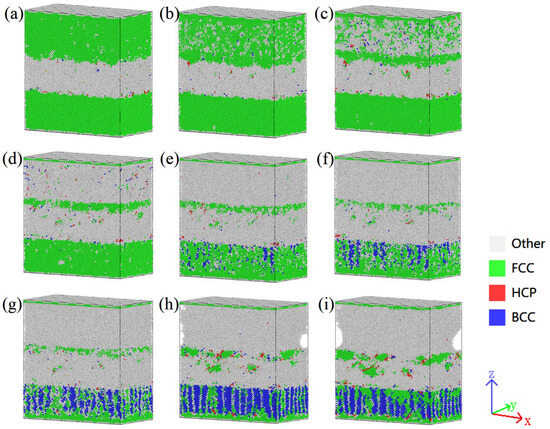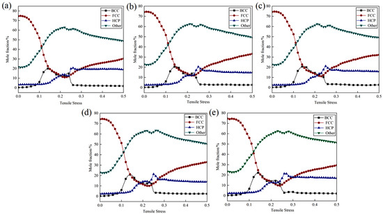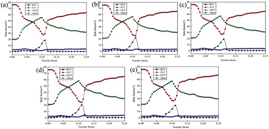 Plastic deformation is typically accompanied by microstructural changes, including dislocation movement, phase transformation, and twinning. Different phases may exhibit varying responses during these processes. The face-centered cubic (FCC) structure, characterized by a greater number of slip systems, is more susceptible to dislocation slip and generally demonstrates superior plastic deformation capabilities. In contrast, although the body-centered cubic (BCC) structure also possesses numerous slip systems, dislocation movement in this structure may encounter more obstacles, resulting in higher strength but lower plasticity compared to FCC. The close-packed hexagonal (HCP) structure, with fewer slip systems, tends to rely more on twinning during deformation, leading to weaker plastic deformation capabilities and a higher propensity for brittle fracture. Figure 4 illustrates the phase structure evolution of Cu-Zr/Al2Cu/Al vertical interfaces with varying Zr contents during the tensile process. As depicted in Figure 4a–e, the overall trends in the phase structures of the five models remain consistent throughout the tensile deformation process: the FCC phase initially decreases before increasing, the Other phase first increases and then decreases, and the BCC phase exhibits a minor peak, while the HCP phase remains nearly unchanged. During the elastic deformation stage, the FCC structure predominates, constituting 76% of the total; the BCC structure comprises approximately 0.35%; the HCP structure accounts for around 2.65%; and the Other-type (Other) structure makes up about 21%. This distribution is attributed to the initial model, where both single-crystal Cu and single-crystal Al are face-centered cubic structures (FCC), while Al2Cu adopts a tetragonal crystal system. At the onset of tensile deformation, the atomic arrangement within the material has not undergone significant changes, resulting in a relatively stable phase structure distribution.