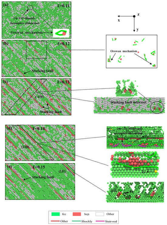 Figure 7 illustrates the DXA analysis of the Cu layer parallel to the interface direction in the Cu-0.2Zr/Al2Cu/Al model during the plastic deformation stage. The combination of stress–strain curves and DXA analysis provides insights into the structural changes and strengthening mechanisms in the Cu layer. Figure 7a illustrates the dispersion of “Other” structures under the influence of the stretching load during the plastic deformation stage at ε = 0.11. This dispersion arises from the disorderly arrangement of atoms in the Cu matrix at normal lattice positions due to tension, leading to a notable increase in vacancies, dislocations, and Other defects, accompanied by an augmentation in the “Other” atom content. Additionally, localized regions exhibit 1/6<112> Shockley partial dislocations that traverse atomic vacancy loops. Conversely, this phenomenon is absent in the Zr-undoped Cu/Al2Cu/Al model during stretching, indicating the presence of a second phase dispersed within the matrix phase. The interaction between this second phase and dislocations fortifies the model’s resistance to deformation by impeding dislocation motion, constituting the Orowan strengthening mechanism. Therefore, Zr doping in the Cu matrix facilitates Orowan strengthening. At ε = 0.12, as depicted in Figure 7b, the Other structures gradually aggregate along the <111> crystal direction, accompanied by a minor generation of HCP structure. The Other structure content increases with strain, while the appearance of HCP structure suggests the emergence of stacking faults along the <111> crystal direction. Simultaneously, the slip system of the Cu layer occurs on the (111) crystal plane, heightening the Orowan strengthening effect under these conditions. At ε = 0.13, Figure 7c demonstrates a sharp rise in stacking fault content within the Cu matrix. Stacking faults are observed to be parallel or intersecting on the (−110) surface, accompanied by the presence of two types of dislocations near the stacking faults: 1/6<112> Shockley partial dislocations and 1/6<110> Stair-rod partial dislocations, indicative of cross-slip characteristics. Compared to Figure 7a,b, the Other structures transition from a relatively dispersed form to clustered clusters, distributed between stacking faults or at the intersection of stacking faults. At ε = 0.14, the stacking fault content reaches its peak, and stair-rod partial dislocations are observed on the (111) surface, resulting from dislocation reactions at the stacking fault [37]: