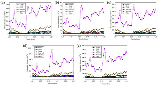 Variation of dislocation length density with strain during vertical interfacial tension in Cu-Zr/Al2Cu/Al model doped with different Zr content: (a) Cu-Zr/Al2Cu/Al; (b) Cu-0.2Zr/Al2Cu/Al; (c) Cu-0.4Zr/Al2Cu/Al; (d) Cu-0.6Zr/Al2Cu/Al; (e) Cu-0.8Zr/Al2Cu/Al.