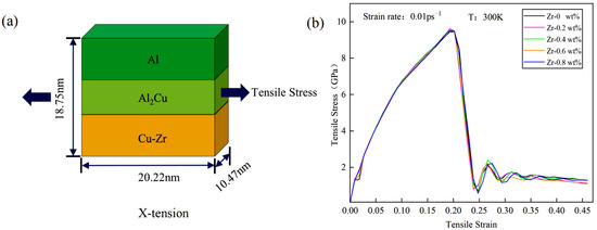 Tensile model and stress–strain curve of Cu-Zr/Al2Cu/Al parallel interface with different Zr content: (a) tensile deformation model of Cu-Zr/Al2Cu/Al parallel interface; (b) stress–strain curves of Cu-Zr/Al2Cu/Al parallel interface under tensile deformation.